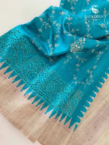 Serene and sophisticated, this Semi Tussar Saree features blue floral jhaal embroidery and intricate cutwork borders for an effortlessly elegant appearance